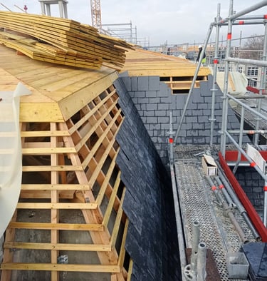 La couverture, qu'elle soit en tuiles, en ardoises ou en zinc, joue un rôle fondamental dans la protection de votre habitation. Elle constitue la première barrière contre les intempéries, même en cas de pluie battante accompagnée de vent violent. Conçue pour résister face au vent, à la neige et aux cycles répétés de gel et de dégel, elle préserve la charpente et l'isolation, assurant ainsi confort thermique et durabilité du bâti.