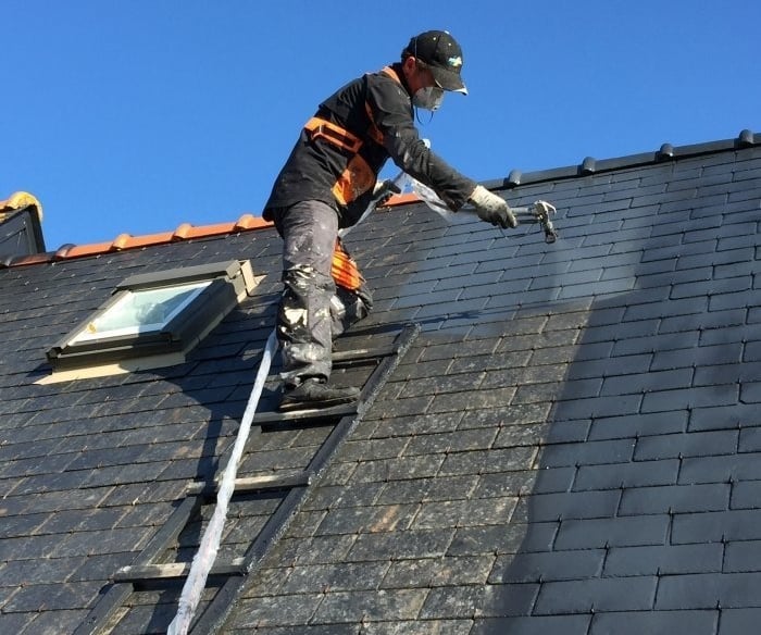 Après un nettoyage en profondeur réalisé avec soin, notre équipe applique une résine hydrofuge colorée – une peinture technique de haute qualité – qui protège durablement votre couverture tout en lui redonnant son éclat d’origine.