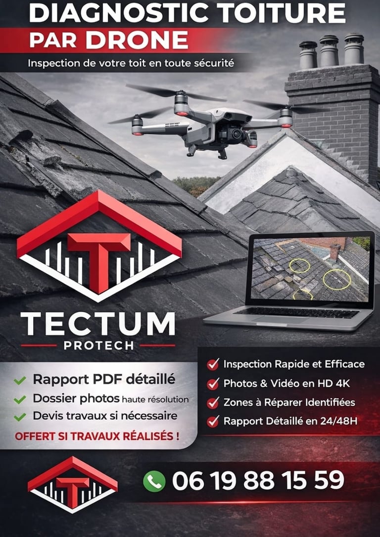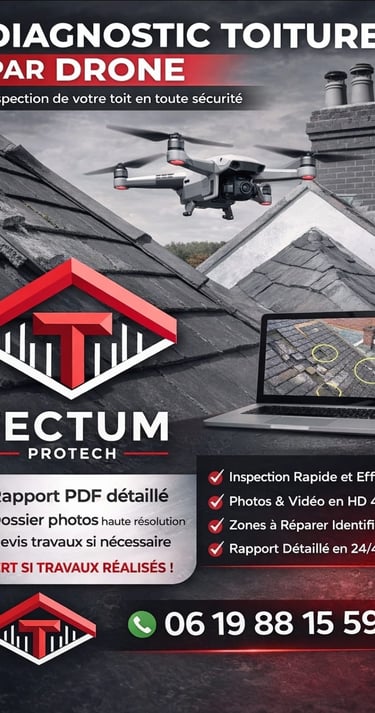 L'équipe de TECTUM PROTECH vous propose ce nouveau service à seulement 369 € TTC. Réalisé par notre droniste spécialisé, vous recevrez un rapport PDF détaillé, un dossier photos & vidéos ultra-haute résolution, ainsi qu'un devis des travaux (si nécessaires)
